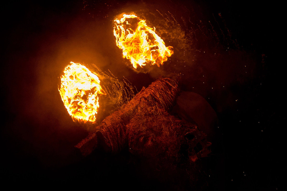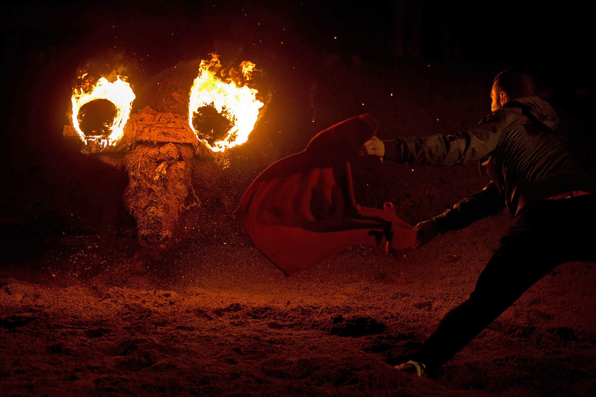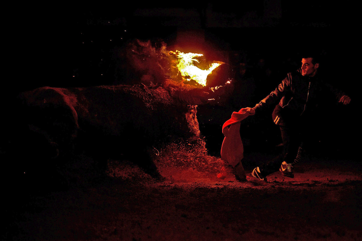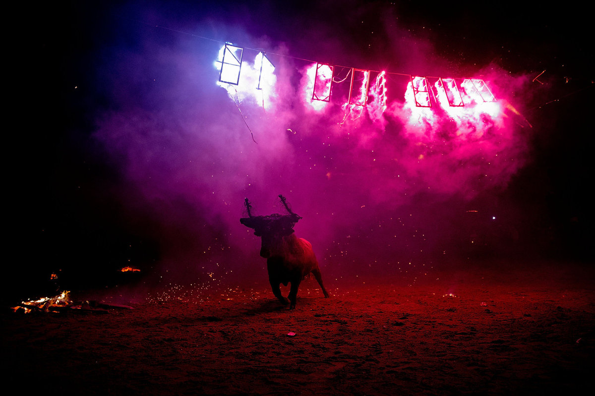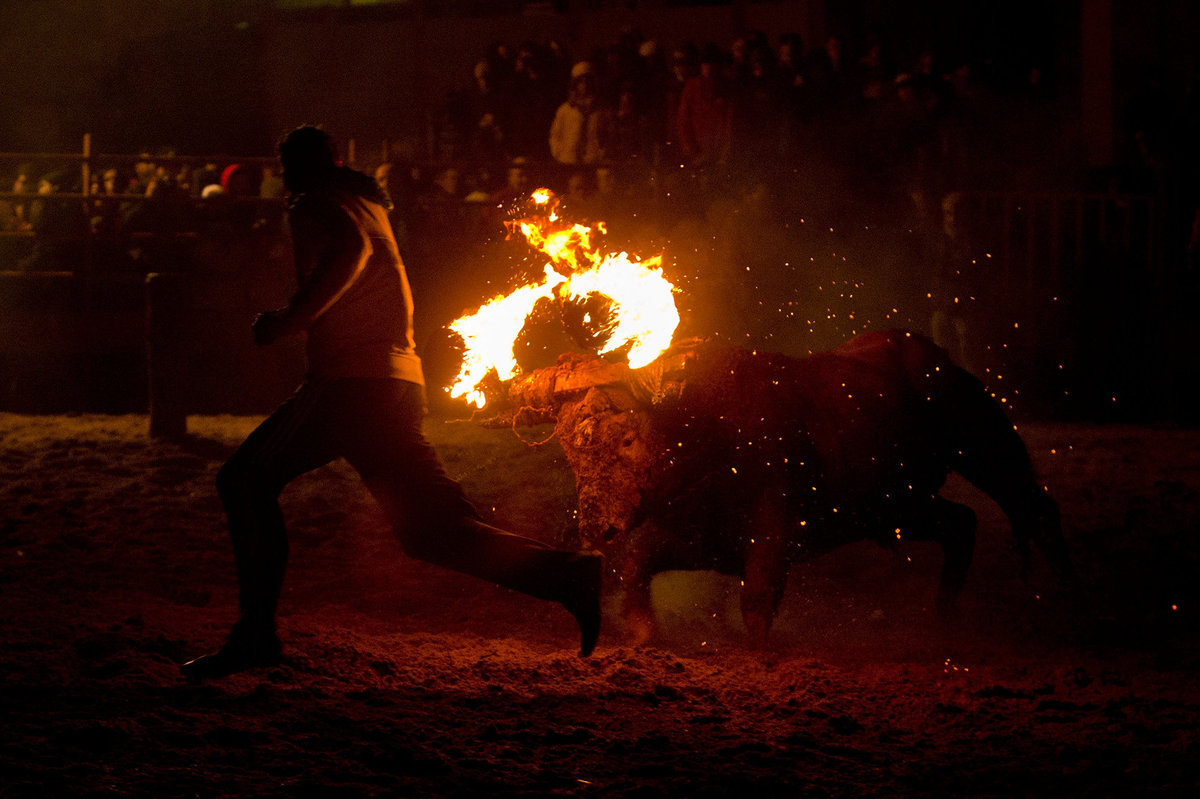 Durante este festejo, se instalan hierros apretados con tornillos a los extremos de los cuernos del toro que contienen unas bolas con liquido inflamable para que arda como una antorcha.
