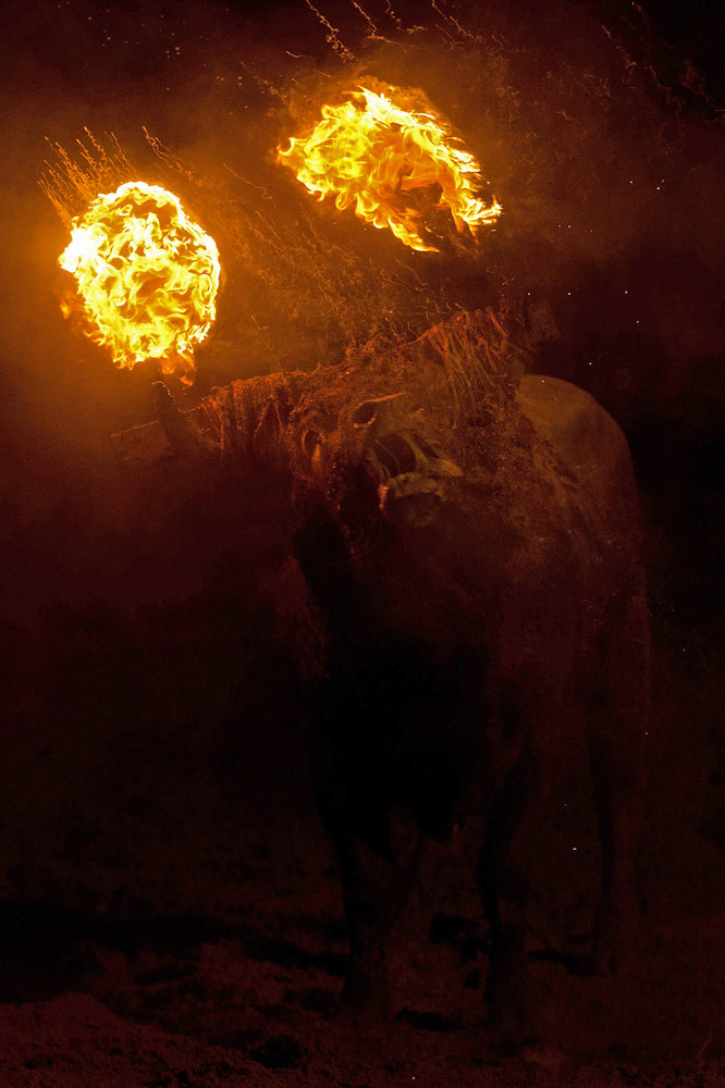 Quienes se oponen a estas prácticas argumentan que el fuego causa pavor a todos los animales, por lo que el toro intenta desesperadamente apagar el fuego que le arde en los cuernos. Sin embargo, el liquido imposibilita que el fuego se apague.